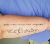 To minimize the spread of black pigment (often seen years later when writing is tattooed too small and dark) I utilize varying degrees of finer needles and/or softer black for intricate details and text. This may reduce incoherent or thick lines forming in the future. Black used if applicable.